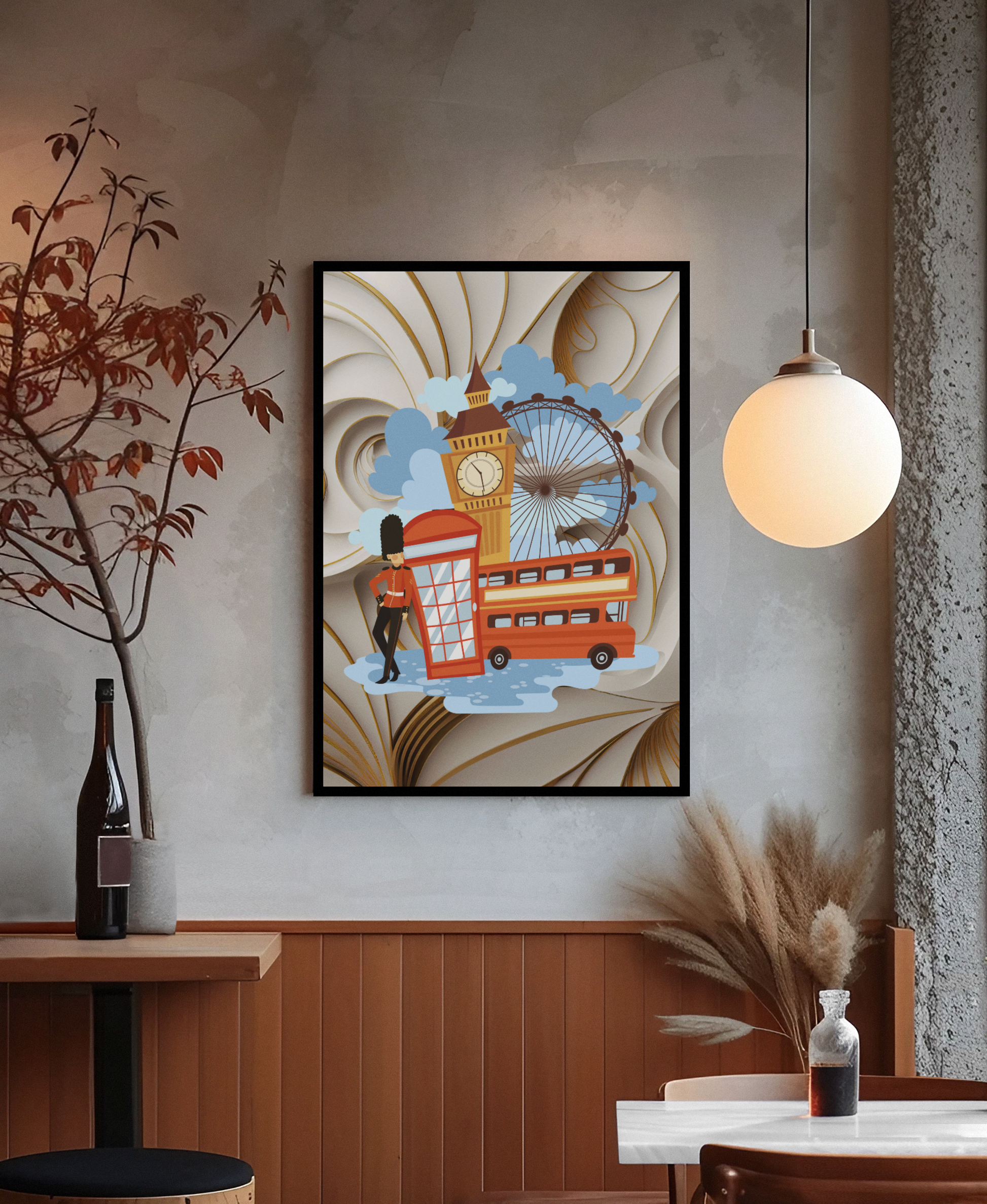 Tauche ein in den unverwechselbaren Charme Londons – mit diesem stilisierten England-Wandbild holst du dir die Essenz britischer Kultur direkt an deine Wand. Die ikonischen Symbole wie Big Ben, Doppeldeckerbus und Telefonzelle verschmelzen mit modernen Linien und weichen Formen zu einem ausdrucksstarken Kunstwerk. Die verspielten Details und warmen Farben machen das Bild zu einem echten Blickfang, der urbanen Stil mit klassischem Flair vereint. Ideal für alle, die London lieben – oder sich ein Stück Weltstadt-Feeling nach Hause holen möchten.