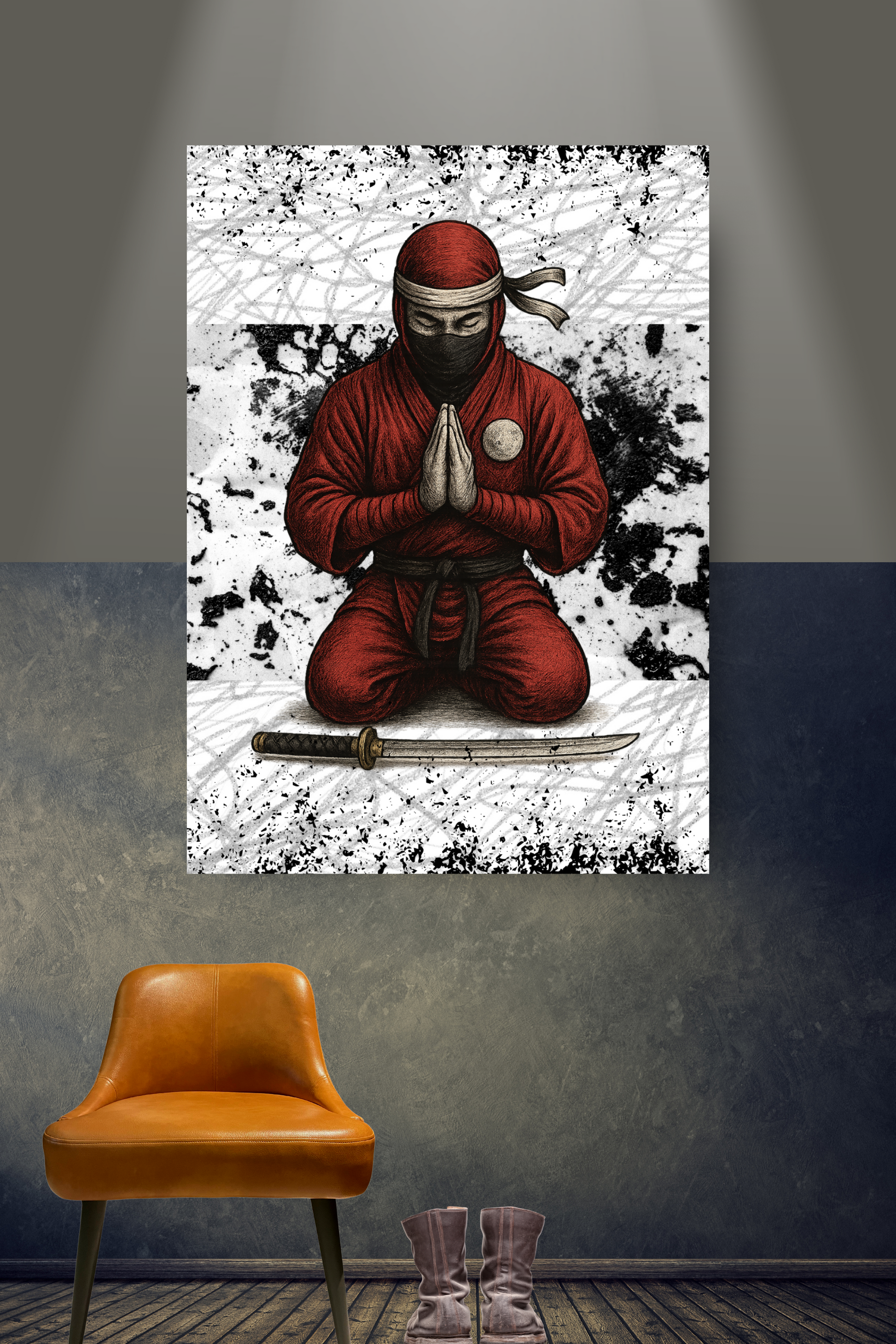 Ob im Wohnzimmer, Büro, Studio oder einer stilvollen Hotellobby – der meditierende Ninja im Kontrastspiel aus Schwarz, Weiß und Rot erzeugt eine Präsenz, die inspiriert und zentriert.